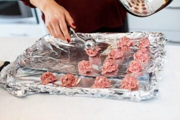 - In a large bowl, mix together pork meatballs (ground pork through pepper) and shape into evenly sized small meatballs using a small cookie scoop or large spoon. Heat grill or broiler on high heat and cook meatballs about 4 minutes per side or until nicely browned; remove from heat and set aside.