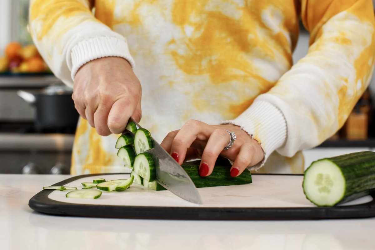Step 2. Then slice your cucumber and shred your carrots.