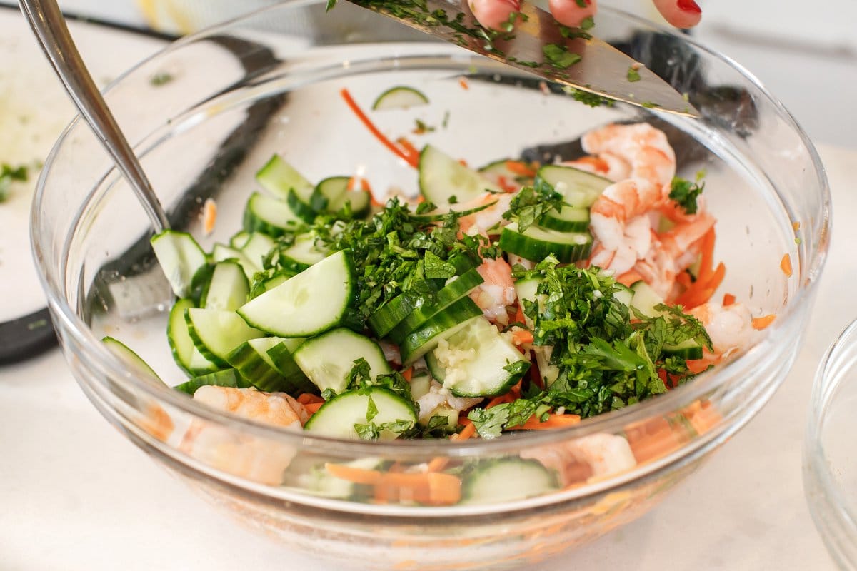 This light and refreshing Vietnamese Shrimp Salad is made with crisp cucumber, meaty shrimp, and tangy chili paste to emulate your favorite fresh rolls in a bowl!