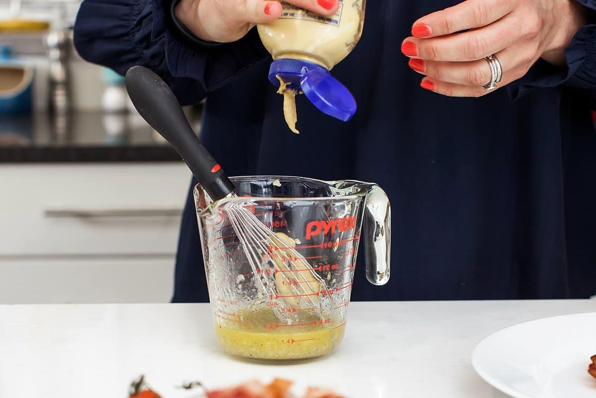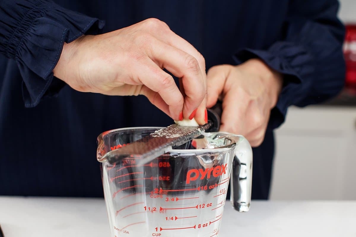 I like to start by making my dressing, so it has time to chill in the fridge. Begin by pouring your lemon juice into a measuring cup, and then grating your garlic with a microplane.