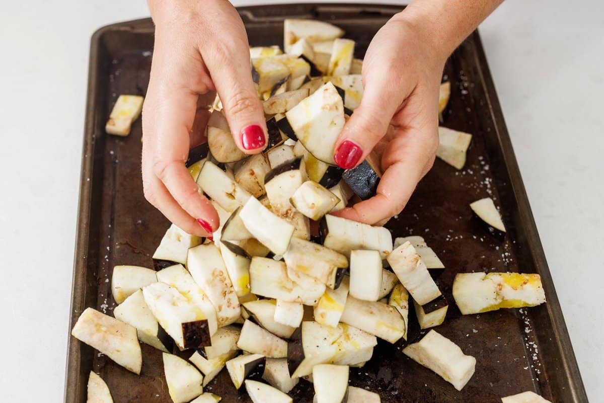 - Spread eggplant cubes on baking sheet in one layer and drizzle with half of the olive oil (two tablespoons), half of the salt (1/2 teaspoon) and half of the pepper (1/4 teaspoon). Use hands to mix around to make sure cubes are evenly coated with oli and spices.