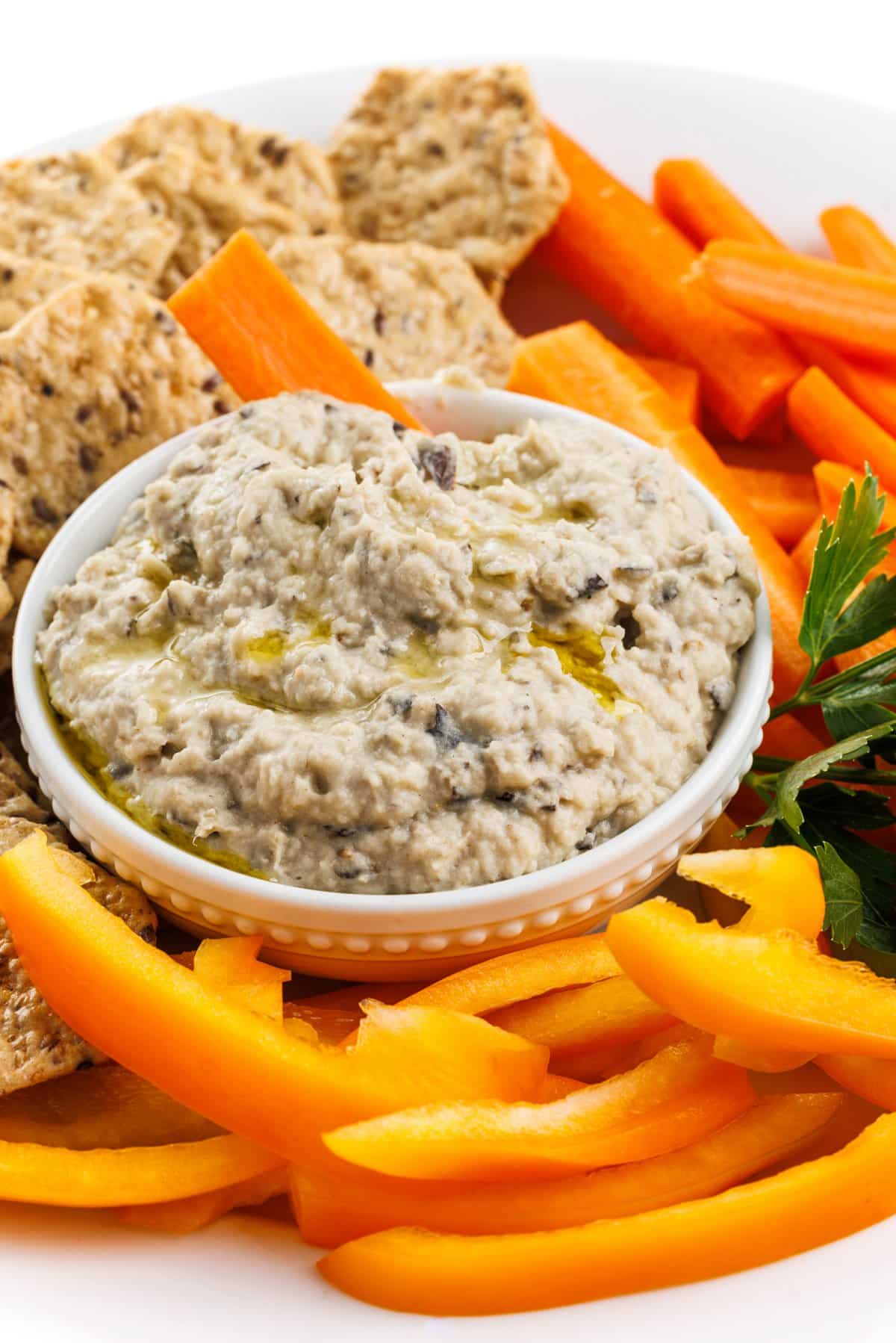 Serve garnished with some fresh parsley alongside fresh veggies or crackers, and enjoy your White Bean and Roasted Eggplant Dip!