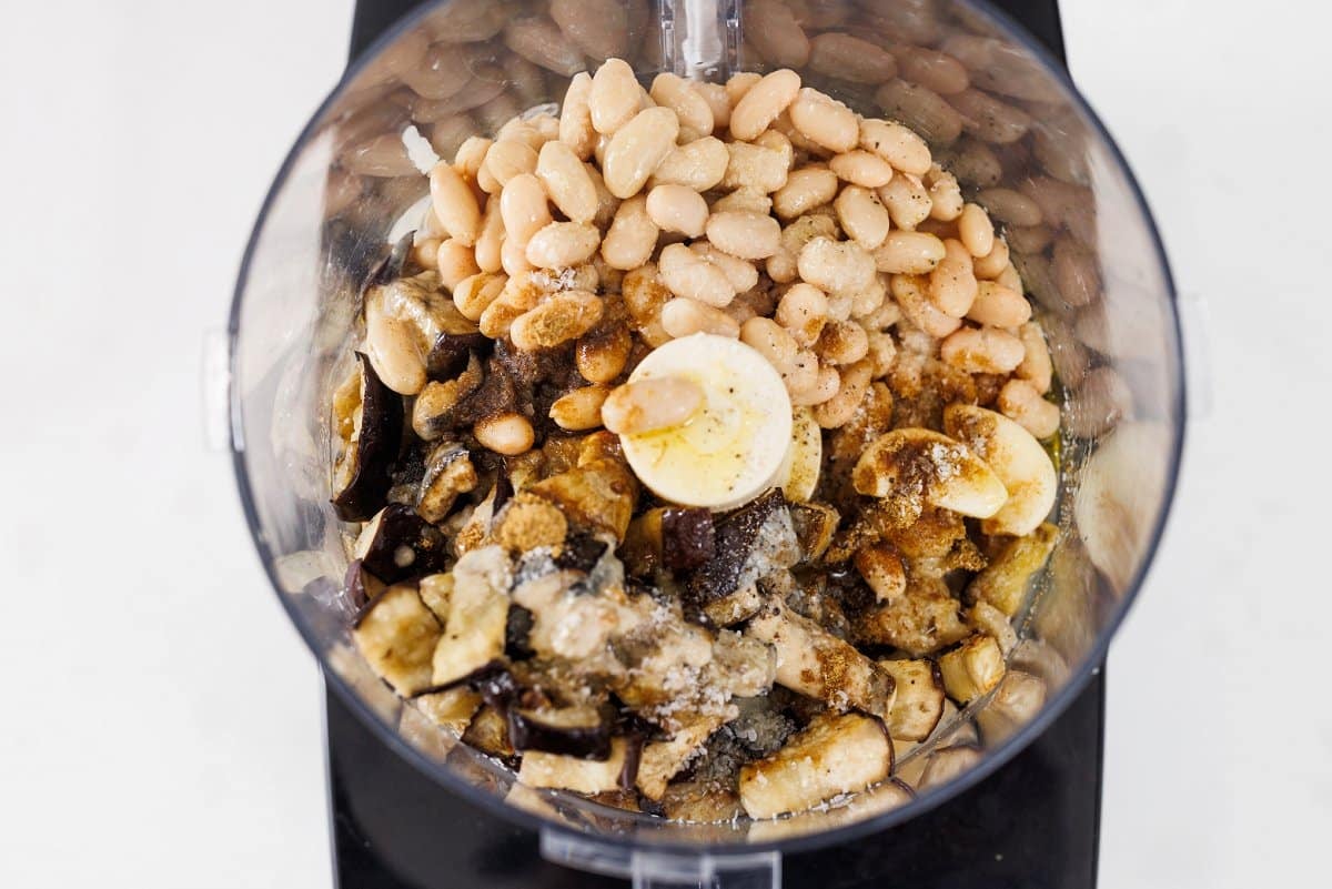 Once eggplant and cooled, add it to a food processor along with the white beans (drained and rinsed), garlic cloves, tahini, lemon juice, cumin, olive oil, salt and pepper.