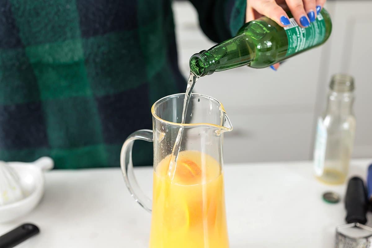Then in a large pitcher, pour in your choice of white wine. I added orange slices for fun, and is totally optional.