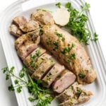 A quick and easy dinner recipe, pork tenderloin is rubbed with a garlicky mustard glaze then roasted until tender and juicy. Leftovers are delicious thinly sliced for a sandwich.