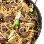 To the same pan, add the onions and saute another minute or two until they begin to caramelize. Place the reserved, cooked rice noodles to the pan, along with the remaining stir-fry sauce and reserved beef. (Be sure to include any juices that have collected!) Stir in the scallions right before serving.