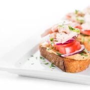 To assemble tartine, spread two tablespoons of Sabra Lemon Twist Hummus on each slice of toasted bread. Top hummus with cucumber, tomato, red onion and shaved chicken.