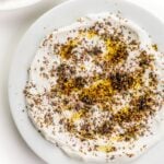 Spread labneh out in a thin layer on a medium serving platter or large plate. It's important to spread out in a thin layer as opposed to serving in a bowl so that every bite gets a bit of the spices and olive oil.