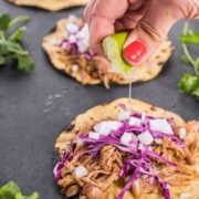 Before serving, carefully shred pork with two forks, discarding any large chunks of excess fat. Serve as is or in tacos, sandwiches, pasta, salads, soups and more.