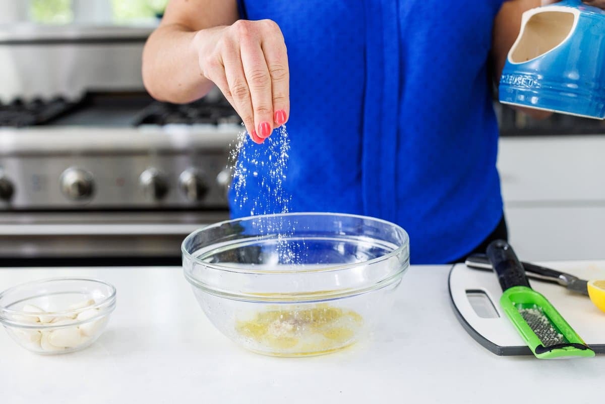 Start your za’atar spiced grilled chicken by making the marinade. First juice your lemon into a large bowl.