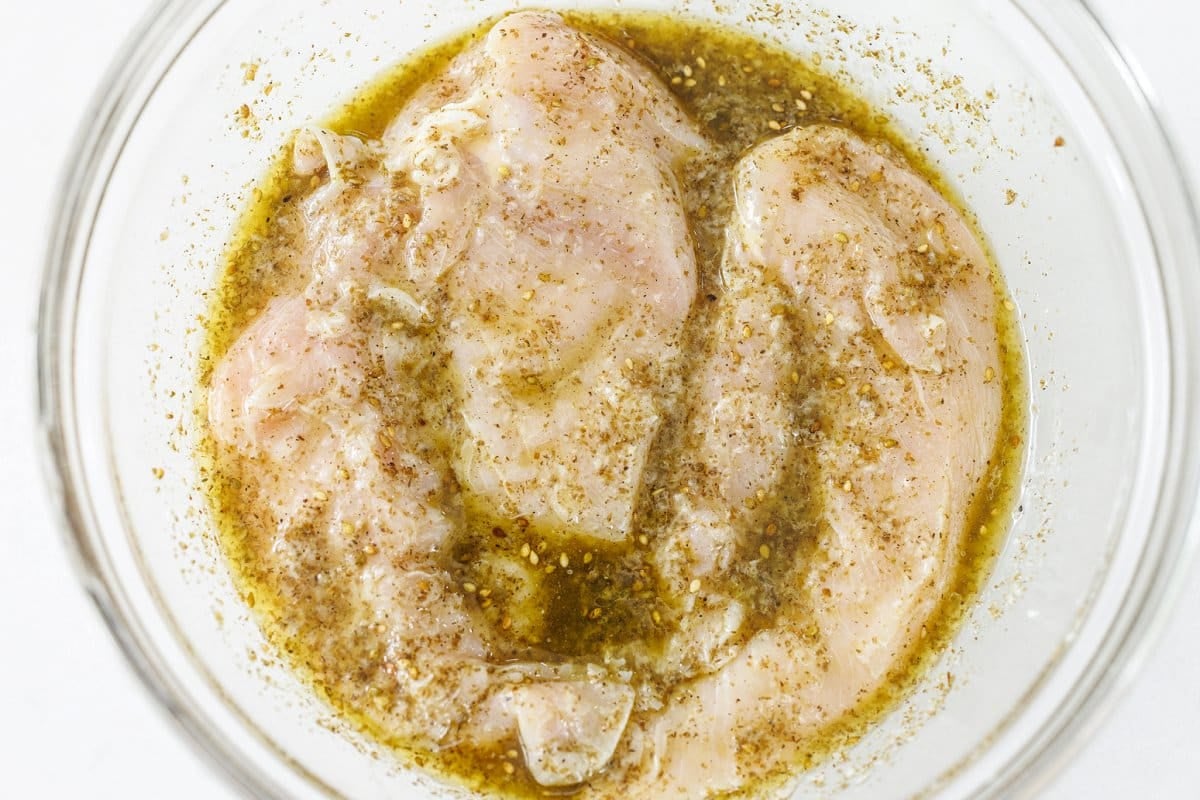 2. In a small bowl, whisk together olive oil, lemon juice, za'atar, garlic, salt, and pepper then pour marinade over the chicken. Move chicken breasts around to ensure they are evenly coated in mixture. Refrigerate for 30 minutes or up to overnight.