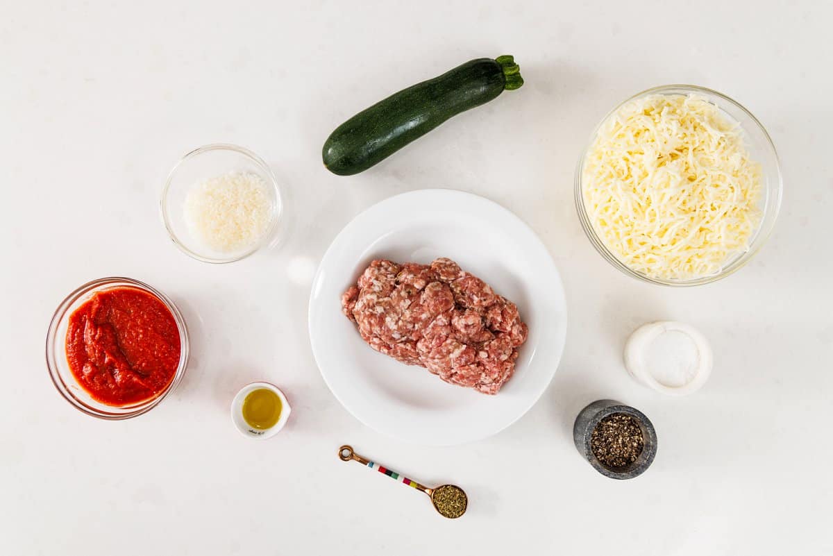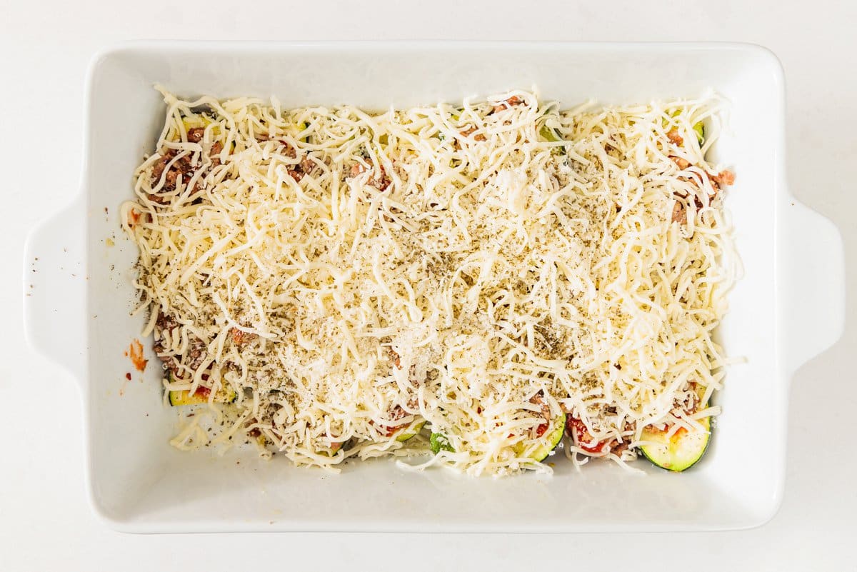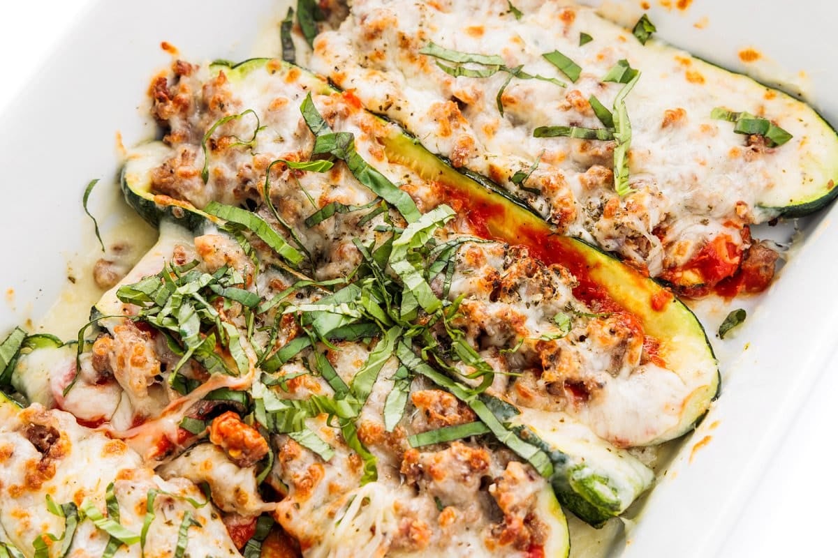- Remove zucchini from oven and pat any moisture that may have accumulated with paper towel. Spread about two tablespoons of marinara sauce in the middle of each zucchini half then top with cooked Italian sausage crumbles, mozzarella cheese and a sprinkle of parmesan. Repeat until all halves are filled then bake for 5 minutes before turning oven to broil then broiling for 3-4 minutes until golden brown. Serve with optional garnish of fresh basil and chili flakes.1 cup marinara sauce, 16 ounces shredded part-skim mozzarella, 1/4 cup grated Parmesan cheese, fresh basil and chili flakes